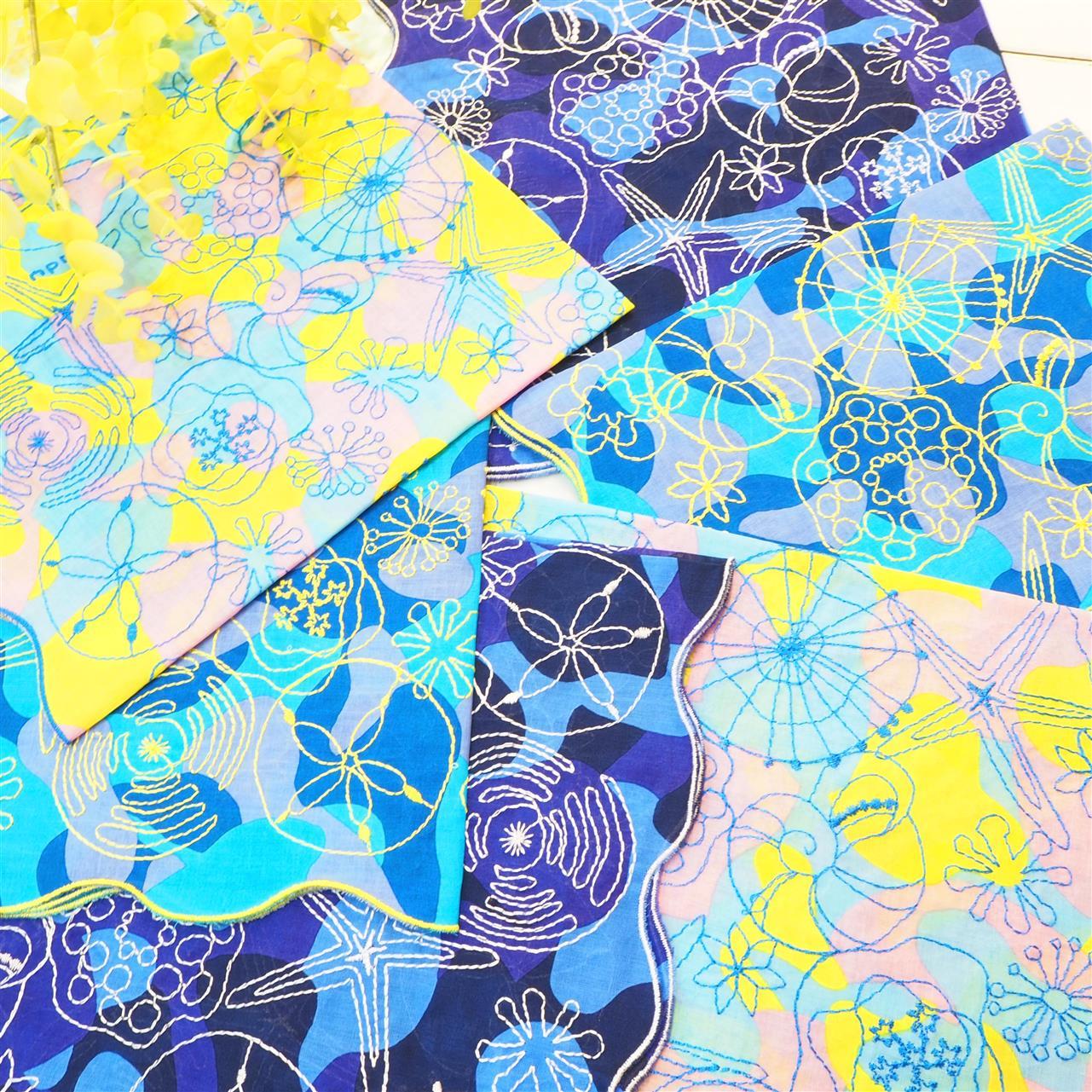 海辺で見られる生き物たちがすべて刺繍で描かれています。